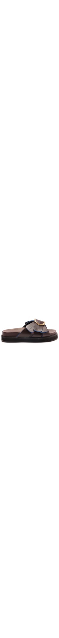 A sandália marrom é produzida em material sintético. A peça possui bico arredondado, alça única na parte frontal, tiras com detalhes pespontados em cor contrastante na parte frontal com fivela metálica aplicada, palmilha com nome da marca timbrado, detalhes pespontados na entressola, salto flat.
