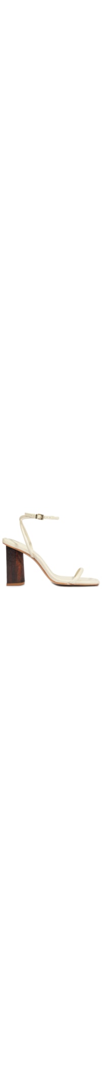A sandália branca é produzida em couro. A peça possui bico arredondada, tiras finas, palmilha macia com nome da marca aplicado, salto bloco alto com acabamento texturizado e fechamento lateral por fivela metalizada.