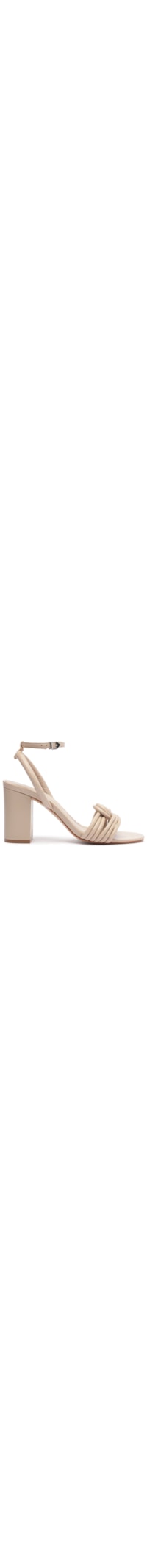 A sandália bege é produzida em couro. A peça possui bico arredondado, tiras frontais médias com detalhe de torção, palmilha macia, tira superior fina, salto alto modelo bloco, solado laqueado e fechamento lateral por fivela metálica regulável.