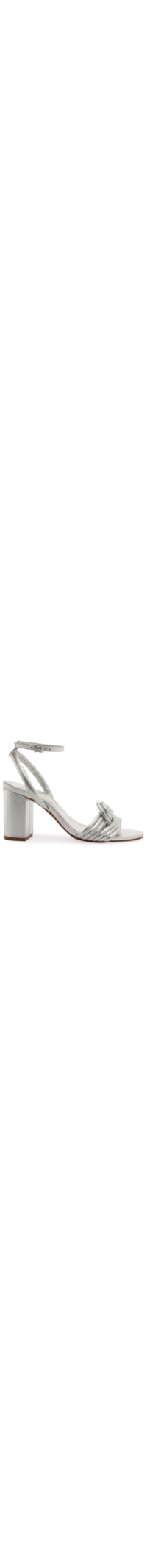A sandália prateada é produzida em material sintético com superfície metalizada. A peça possui bico arredondado, tiras finas entrelaçadas na parte frontal com detalhe de nó, tira fina posterior e no tornozelo, palmilha macia com nome da marca timbrado, salto médio de modelo bloco, solado laqueado e fechamento superior por fivela metálica regulável.