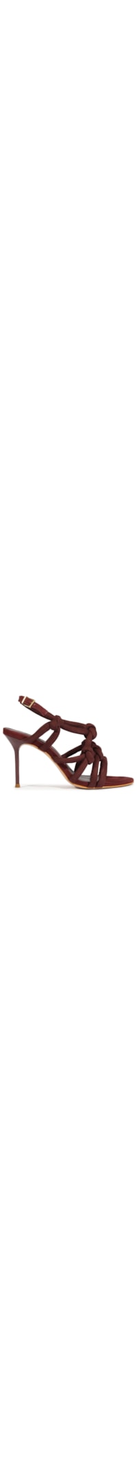 A sandália vinho é produzida em camurça. A peça possui bico arredondado, palmilha macia, tiras médias com detalhe de nós, salto alto fino, solado laqueado e fechamento lateral por fivela metálica regulável.