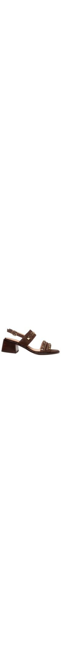 A sandália marrom é produzida por camurça. A peça possui bico arredondado, duas tiras médias na parte superior com aplicação de tachas, rebites e aviamentos metalizados, palmilha macia com nome da marca aplicado na cor dourado em baixo-relevo, entressola em camurça, solado laqueado e fechamento posterior por fivela.