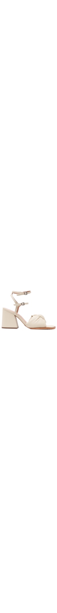 A sandália bege é produzida em couro. A peça possui bico quadrado com bordas arredondadas, parte frontal acolchoada com formato de laço, palmilha macia com nome da marca timbrado, salto alto estilizado modelo bloco, solado laqueado e fechamento por fivelas reguláveis em tiras duplas.