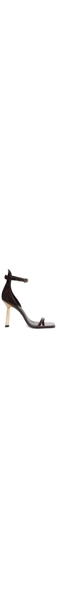 A sandália marrom é produzida em couro. A peça possui bico quadrado, tira fina aplicada na parte superior e na altura do tornozelo, palmilha macia com nome timbrado, salto alto fino, efeito envernizado e fechamento lateral por fivela metalizada regulável.