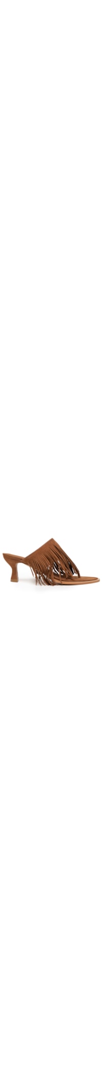 A sandália marrom é produzida em nobuck. A peça possui bico arredondado, tira larga com franjas, palmilha com nome da marca em baixo-relevo, salto médio fino e solado laqueado.