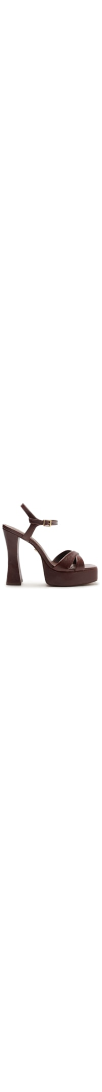A sandália marrom é produzida em couro. A peça possui bico quadrado, tiras médias cruzadas na parte frontal, palmilha com o nome da marca estampado em tom metalizado, salto alto de modelo meia pata, solado laqueado e fechamento lateral por fivela metalizada.
