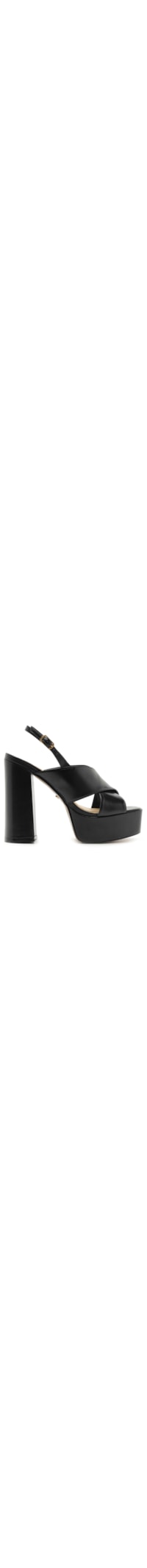 A sandália preta é produzida em couro. A peça possui bico arredondado, tiras largas cruzadas na parte superior, palmilha com o nome da marca em tom metalizado, salto alto meia pata, solado laqueado e fechamento posterior por fivela metálica.