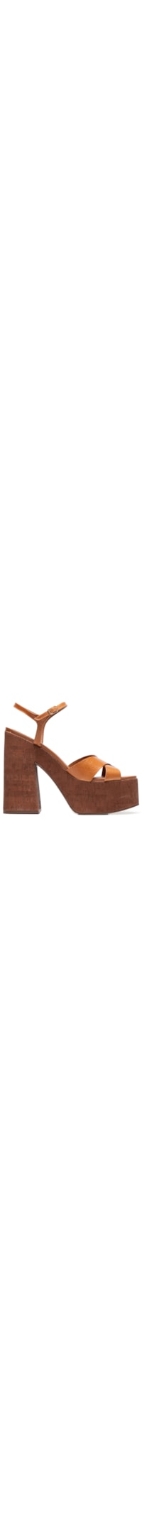 A sandália marrom é produzida em couro com superfície texturizada. A peça possui bico arredondado, tiras superiores largas transpassadas, palmilha com o nome da marca aplicado em tom metalizado, entressola em cortiça texturizada e salto alto meia pata e fechamento posterior por tiras finas e fivela metalizada para ajuste.