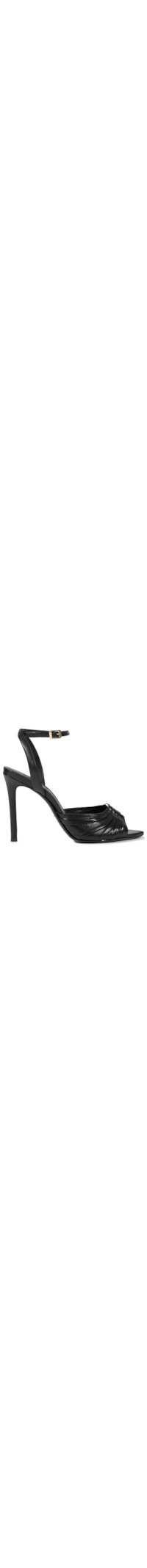 A sandália preta é produzida em couro. A peça possui bico arredondado, tira larga na parte frontal com recortes e aviamento metálico, tira fina na parte superior, palmilha macia com nome da marca em baixo-relevo, solado laqueado, salto alto fino e fechamento lateral por fivela metálica regulável.