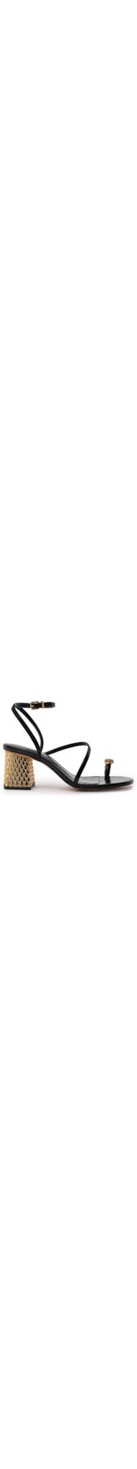 A sandália preta é produzida em couro. A peça possui bico arredondado, tira frontal para encaixe com detalhe de aviamento metálico em formato figurativo de cabeça de cobra, tira fina sobreposta, saldo alto de modelo bloco com superfície texturizada em metal dourado, palmilha macia, solado laqueado e fechamento por fivela ajustável.