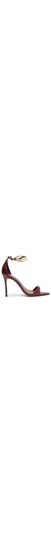 A sandália vinho é produzida em couro. A peça possui bico fino, tira fina frontal, palmilha com o nome da marca aplicado em tom metalizado, salto alto fino, solado laqueado e fechamento superior em tira fina com aplicação metálica arredondada, perfuros e fivela metalizada.