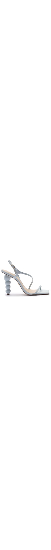A sandália azul é produzida em couro. A peça possui bico quadrado, tiras finas frontais e posterior, palmilha macia com nome da marca em baixo-relevo, salto alto geométrico e solado laqueado.