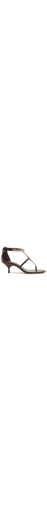 A sandália marrom é produzida em couro. A peça possui bico arredondado, tiras finas aplicadas na parte superior, palmilha com nome da marca escrito em dourado, aplicação de corrente metalizada na parte superior, salto médio fino, solado laqueado e fechamento posterior por zíper.