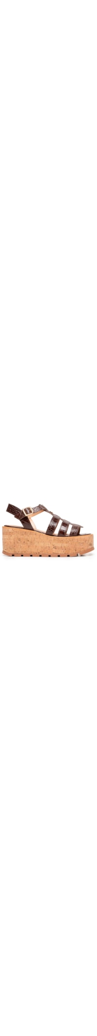 A sandália marrom é produzida em couro com acabamento croco. A peça possui bico arredondado, tiras médias cruzadas na parte superior, logo da marca metalizado aplicado na parte superior, palmilha macia com nome da marca timbrado, salto alto plataforma em cortiça, solado tratorado e fechamento lateral por fivela metálica.