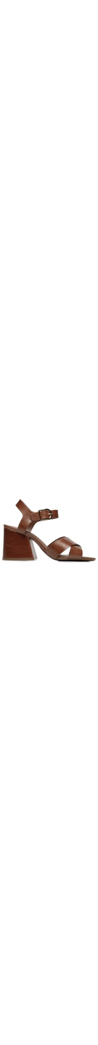A sandália marrom é produzida em couro. A peça possui bico arredondado, tiras médias transpassadas na parte frontal, tiras médias aplicadas na parte posterior, palmilha macia com nome da marca aplicado em baixo-relevo, salto médio bloco, solado emborrachado e fechamento lateral por fivela metalizada regulável.
