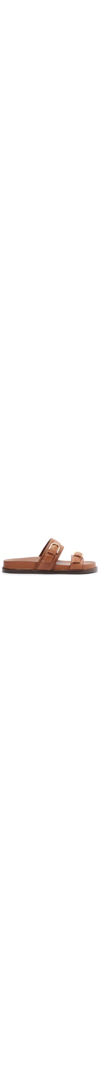 A sandália bege é produzida em material sintético. A peça possui bico arredondado, palmilha macia, tiras médias com regulagem por fivela metálica e solado emborrachado.