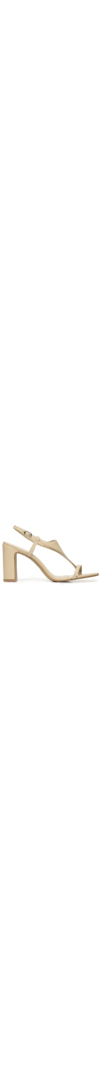 A sandália bege é produzida em couro. A peça possui bico redondo, tira média dividindo os dedos, tira fina sobreposta, salto alto de modelo bloco, palmilha macia com o nome da marca aplicado em cor contrastante metalizada, solado laqueado e fechamento lateral por fivela.