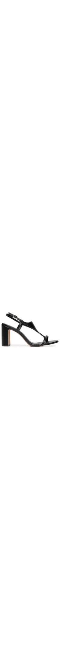 A sandália preto é produzida em couro. A peça possui bico redondo, tira média dividindo os dedos, tira fina sobreposta, salto alto de modelo bloco, palmilha macia com o nome da marca aplicado em cor contrastante metalizada, solado laqueado e fechamento lateral por fivela.