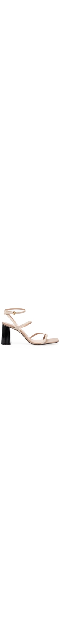 A sandália bege é produzida em couro. A peça possui bico quadrado, tiras finas frontais cruzadas, tira lateral com recorte de elástico, palmilha com nome da marca gravado, salto médio bloco com superfície texturizada e fechamento superior por fivela regulável.