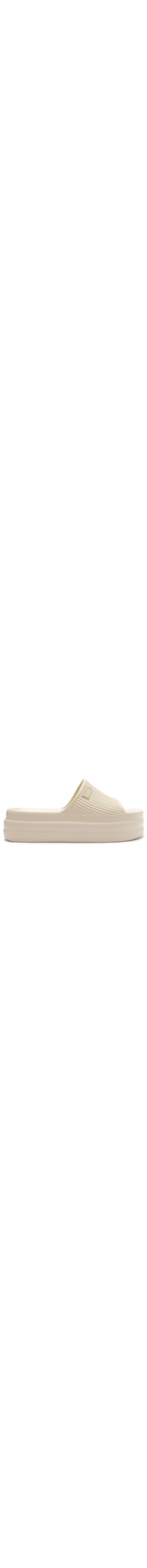 A sandália bege é produzida em E.V.A. A peça possui bico arredondado, tira larga com detalhe de listras em relevo e com tag da marca aplicada, entressola com frisos e plataforma alta.