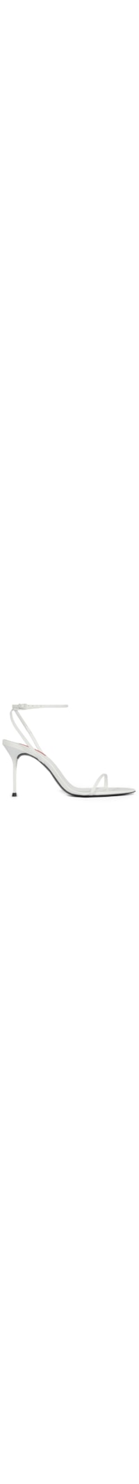 A sandália branca é produzida em couro com superfície envernizada. A peça possui bico arredondado, tiras finas na parte frontal e no tornozelo, palmilha macia com tag da marca aplicada de cor contrastante, salto alto fino, solado laqueado e fechamento lateral por fivela regulável.
