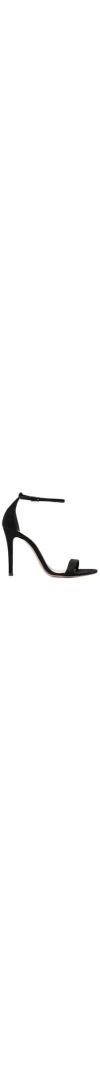 A sandália preta é produzida em camurça. A peça possui bico arredondado, tira frontal média e superior fina, palmilha em cor contrastante com detalhe do nome da marca, salto alto fino, solado laqueado e fechamento lateral por fivela metálica regulável.