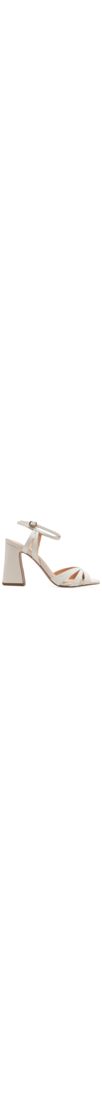 A sandália branca é produzida em couro. A peça possui bico quadrado, tiras finas frontais e nas laterais, tiras finas cruzadas no calcanhar, palmilha macia com nome da marca gravado, salto alto bloco, solado laqueado e fechamento superior por fivela metálica regulável.