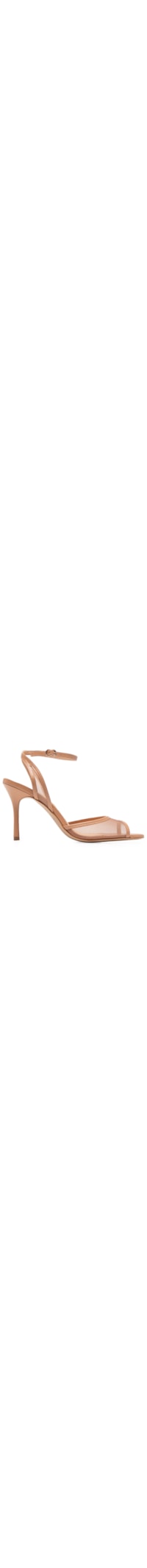 A sandália bege é produzida em couro. A peça possui bico fino, tira larga frontal com recorte em tela com transparência, tiras laterais com tela aplicada e cruzada na parte frontal do calcanhar, palmilha macia com nome da marca gravado, salto fino alto, solado laqueado e fechamento superior por fivela metálica com regulagem.