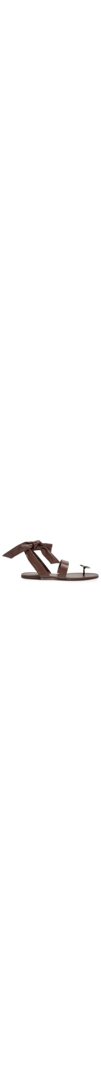 A sandália marrom é produzida em couro. A peça possui bico arredondado, tiras médias, aplicação frontal metálica, tiras alongadas na para superior, salto flat e fechamento por amarração.