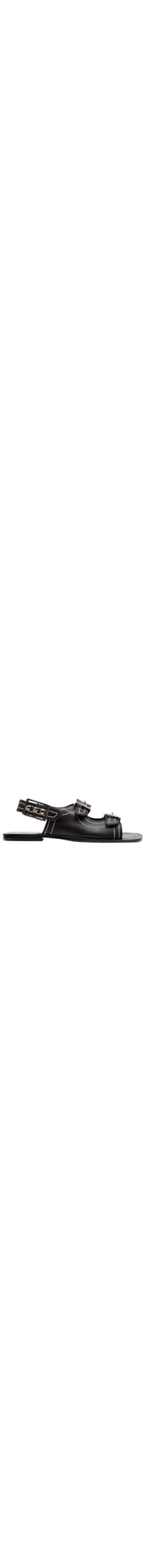 A sandália preta é produzida em material sintético. A peça possui bico quadrado, parte superior com tira dupla, detalhe de fivelas metalizadas aplicados para ajuste na parte superior, palmilha com detalhe de pespontos em tom contrastante e nome da marca metalizado estampado, solado liso com pequeno salto e fechamento lateral em tira com fivela regulável com as iniciais da marca aplicados em baixo relevo.