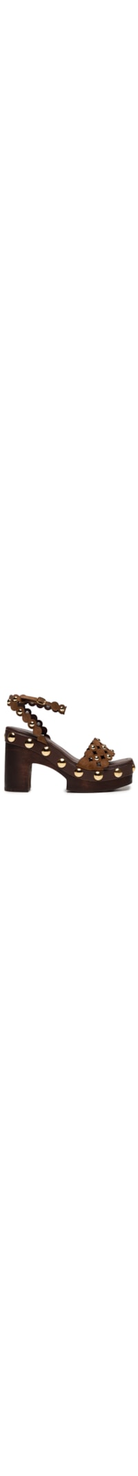 A sandália marrom é produzida em couro. A peça de modelo meia pata possui bico quadrado, tira superior com aplicação de tachas metálicas, salto alto modelo bloco, palmilha macia com nome da marca em relevo, entressola com aplicações metálicas, solado laqueado, acabamento pespontado e fechamento lateral por fivela ajustável.