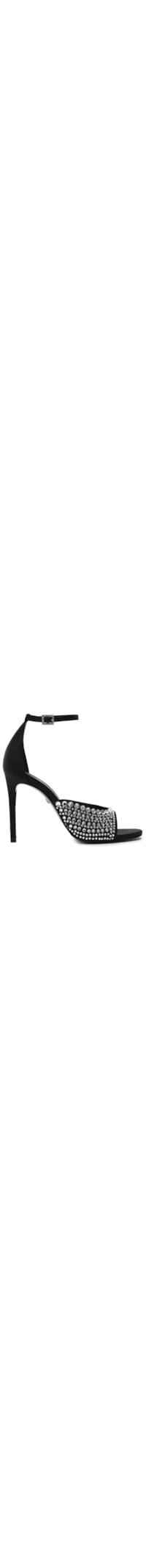 A sandália preta é produzida em material têxtil. A peça possui bico arredondado, tira fina na parte frontal com cristais Swarovski aplicados em tamanhos variados, tira fina superior, palmilha de couro com nome da marca em baixo-relevo, salto fino alto e fechamento superior por fivela metálica com pedrarias aplicadas.