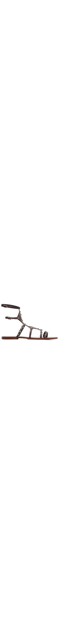 A sandália marrom é produzida em couro. A peça de modelo rasteira possui bico arredondo, tiras frontais e superiores finas com recorte geométrico e aplicação de rebites metálicos em tamanhos variados, tira para encaixe do dedo, palmilha com nome da marca metalizado, solado laqueado e fechamento lateral por fivela ajustável.