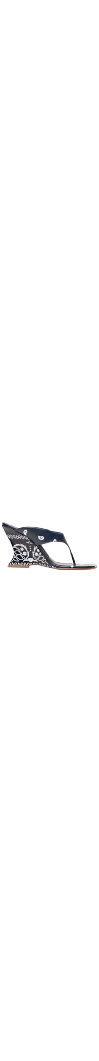 A sandália azul é produzida em couro. A peça possui bico quadrado, tiras grossas laterais, tira fina para o dedo, palmilha macia com o nome da marca aplicado em baixo-relevo, salto alto geométrico e padronagem figurativa em cor contrastante.