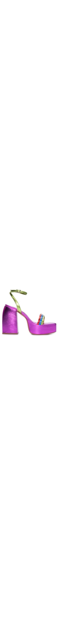 A sandália roxa é produzida em couro com superfície metalizada. A peça possui bico quadrado, tiras superiores estreias em cores contrastante com aplicações de tarraxas, palmilha macia com nome da marca em relevo, salto alto modelo bloco, meia pata elevada, solado laqueado, acabamento pespontado e fechamento lateral por fivela ajustável.