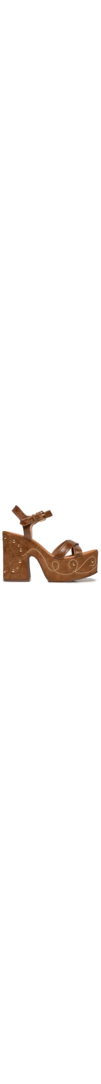 A sandália bege é produzida em camurça. A peça de modelo meia pata possui bico arredondado, tiras cruzadas na parte superior, salto alto modelo bloco, palmilha com o nome da marca aplicado, entressola com detalhes bordados, aplicação de tachas metálicas e detalhe figurativo em relevo baixo, solado laqueado e fechamento lateral por fivela metálica ajustável.