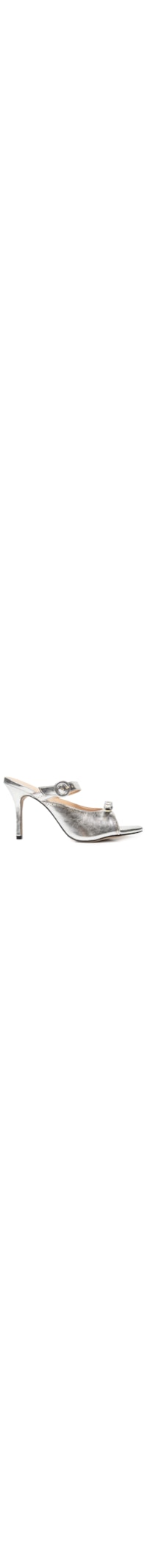 A sandália prateada é produzida em couro. A peça possui bico arredondado, tira fina superior, recorte aberto na parte frontal, perfuros, detalhe em formato figurativo de laço aplicado na parte superior, palmilha macia com nome da marca timbrado, salto alto fino e fechamento lateral por fivela regulável.