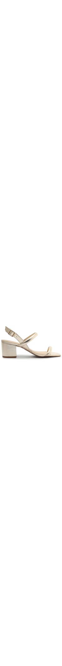 A sandália dourado é produzida em couro. A peça possui bico quadrado, tiras superiores médias, tira média em torno do calcanhar, palmilha macia com nome da marca aplicado, salto baixo modelo bloco, solado laqueado e fechamento lateral por fivela metálica regulável.