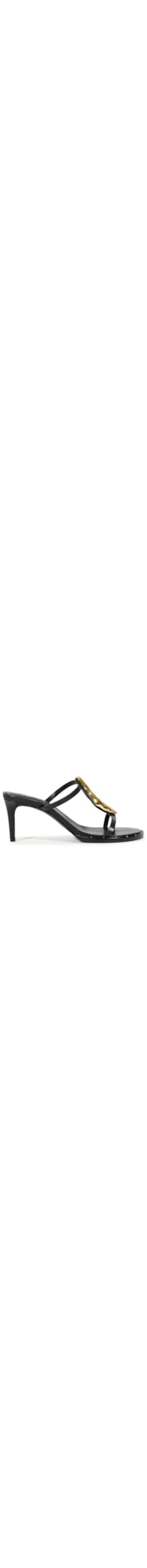 A sandália preta é produzida em couro. A peça possui bico arredondado, tiras finas, aplicação superior metálica com formato orgânico, palmilha macia e com tachas metálicas e salto alto.