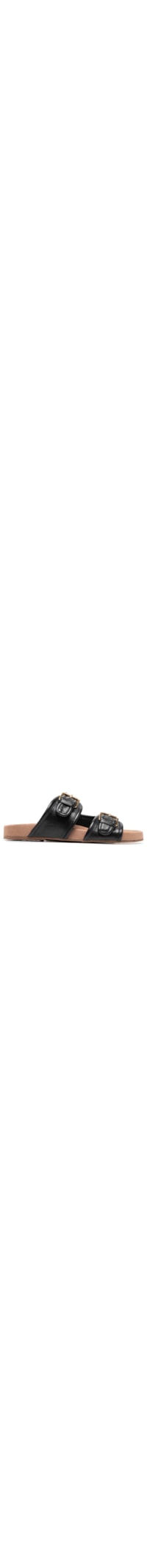 A sandália preta é produzido em couro. A peça possui bico arredondado, tiras médias com passante fixo e reguláveis por fivelas metálicas, entressola em camurça marrom e solado emborrachado.