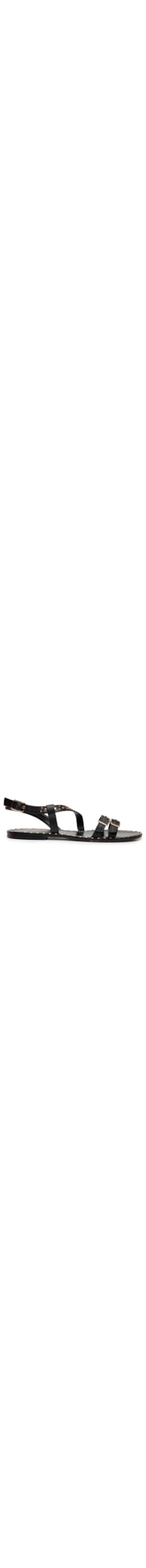 A sandália preta é produzida em couro. A peça possui bico arredondado, tiras finas aplicadas nas partes superior e posterior, aplicação de tachas metalizadas, acabamento pespontado em cor contrastante, nome da marca timbrado na palmilha, solado flat e fechamento lateral por fivelas metalizadas reguláveis.