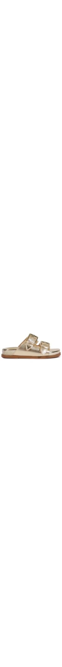 A sandália dourada é produzida em couro. A peça possui bico arredondado, tiras médias aplicadas na parte posterior, palmilha macia e fechamento superior por fivelas metalizadas reguláveis.