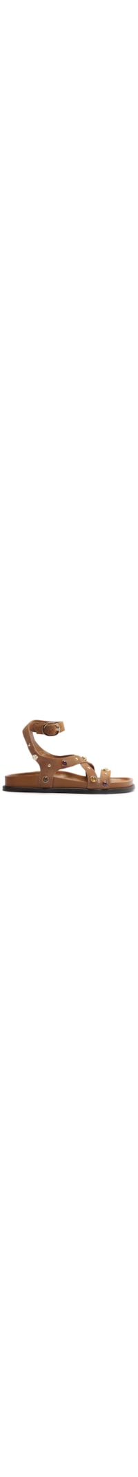A sandália bege é produzida em camurça. A peça de modelo papete possui bico arredondado, tiras médias cruzadas na parte superior, aplicação de aviamentos nas tiras em cores contrastantes, palmilha com nome da marca timbrado na cor prata e fechamento lateral por fivela metálica regulável.