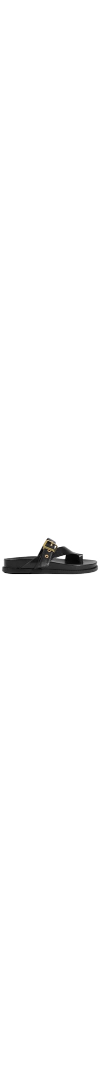 A sandália preta é produzida em couro. A peça de modelo papete possui bico arredondado, palmilha com nome da marca em baixo-relevo, tiras médias com ilhoses e passante metálico na parte lateral e fechamento lateral por fivela metálica com regulagem.