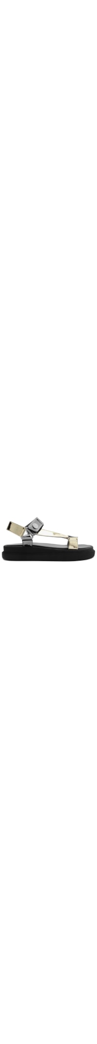 A sandália dourada é produzida em material sintético com superfície metalizada. A peça de modelo papete possui bico arredondado, tiras médias em cor contrastante e com detalhes metálicos com formato triangular, palmilha macia, solado emborrachado e fechamento superior por velcro.