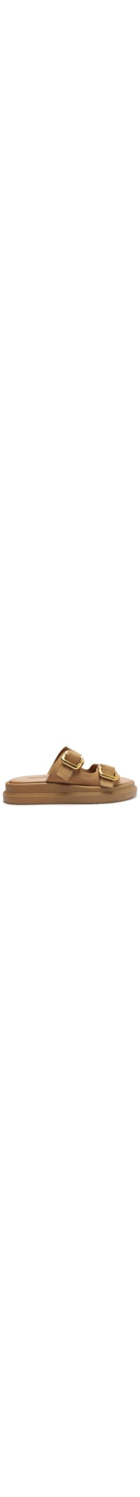 A sandália bege é produzida em suede. A peça possui bico arredondado, tiras largas superiores com fivelas metálias aplicadas, palmilha com nome da marca em baixo-relevo, entressola emborrachada e solado flatform levemente tratorado.