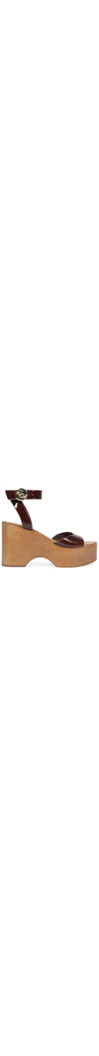 A sandália marrom é produzida em couro. A peça possui bico arredondado, tira superior alongada, tira posterior média com aviamento metalizado, palmilha macia com nome da marca em baixo-relevo, salto alto de modelo plataforma, solado laqueado e fechamento lateral.