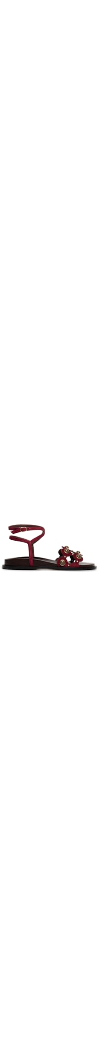 A sandália vermelha é produzida em camurça. A peça de modelo rasteira possui bico arredondado, tiras superiores com recortes em formato geométrico e aplicação de tachas metálicas com pedras sintéticas em cor contrastante, tiras finas cruzadas na parte superior, palmilha alta com o nome da marca aplicado e fechamento posterior por fivela metálica regulável.