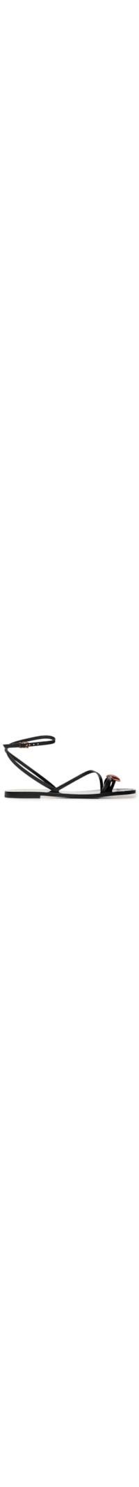 A sandália preta é produzida em couro. A peça possui tiras finas cruzadas no cabedal, aplicação de pedra resinada com borda metalizada na parte frontal, palmilha lisa com logo da marca, solado flat e fechamento lateral por fivela ajustável.