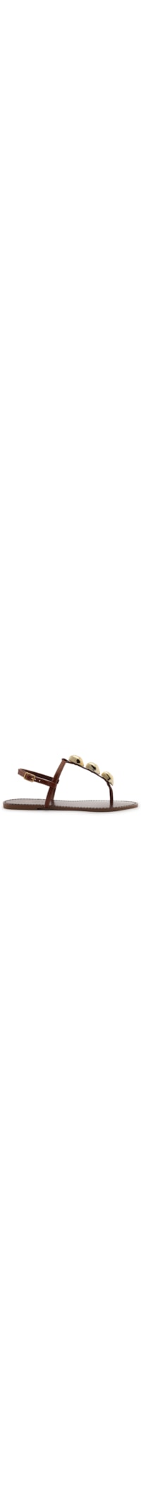 A sandália marrom é produzida em couro. A peça possui bico arredondado, tiras finas na parte superior com aplicação de aviamentos metalizados em formato orgânico, palmilha com nome da marca escrito em dourado, salto flat, e fechamento regulável lateral por fivela.